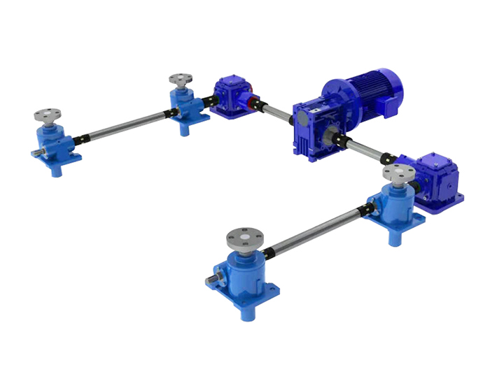 多臺聯(lián)動絲桿升降機平臺,電機在中間,電機連接轉向箱或者K系列減速機,在通過連接桿和···
